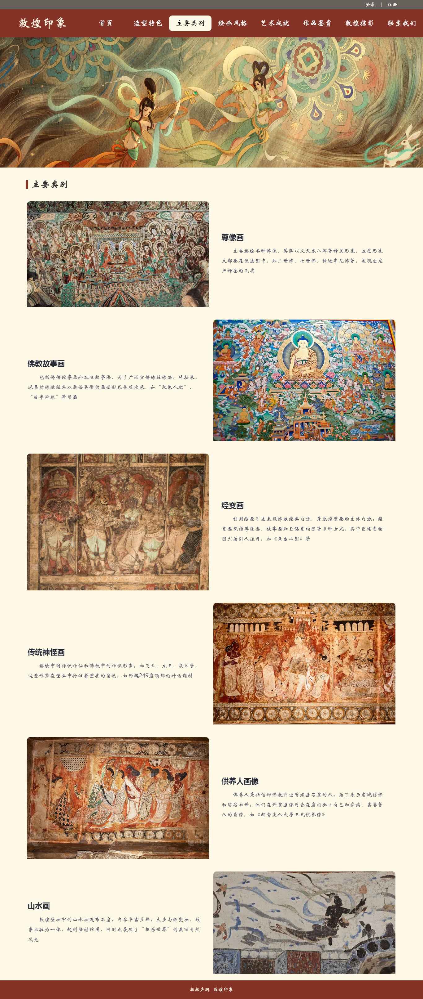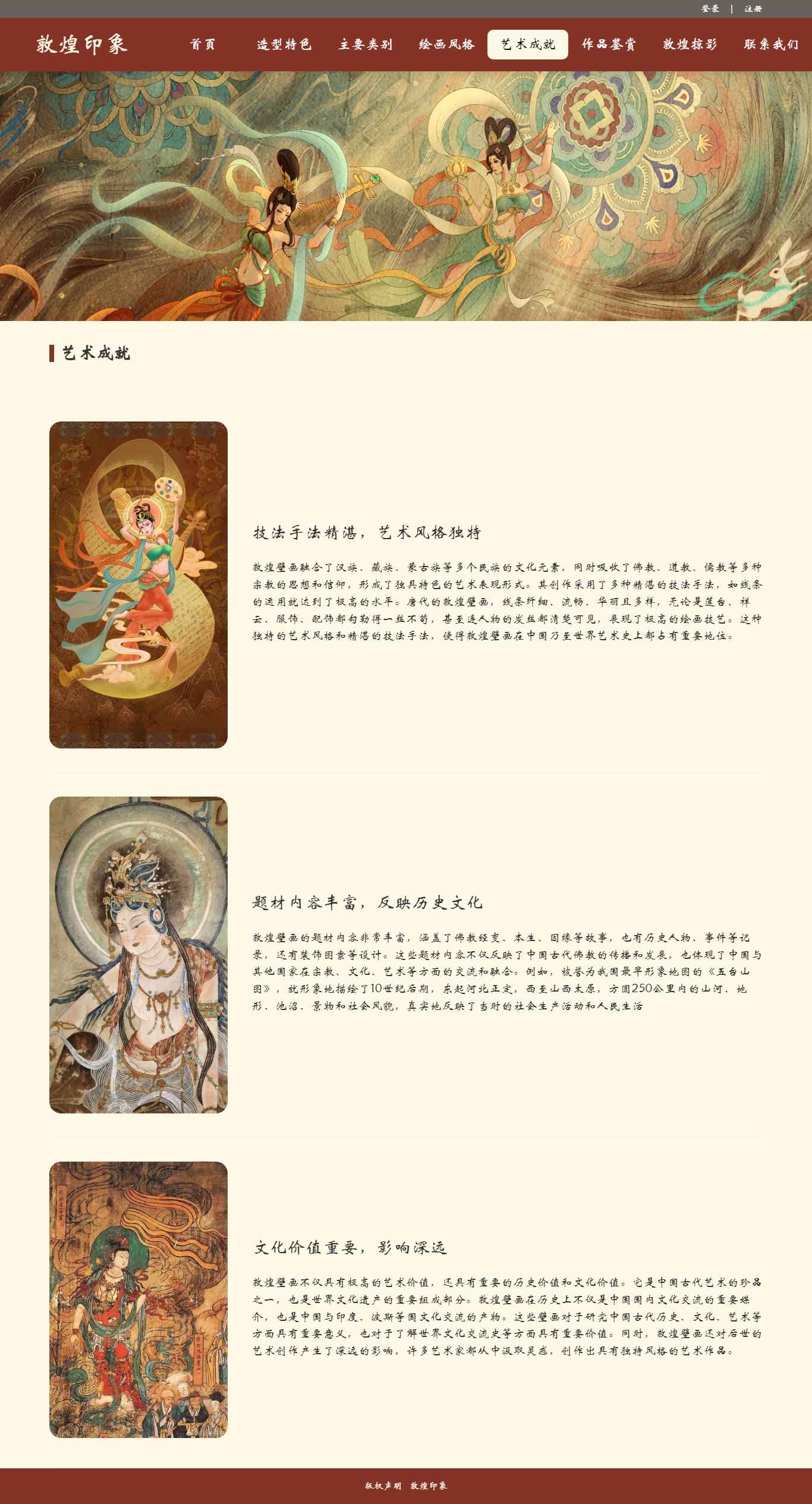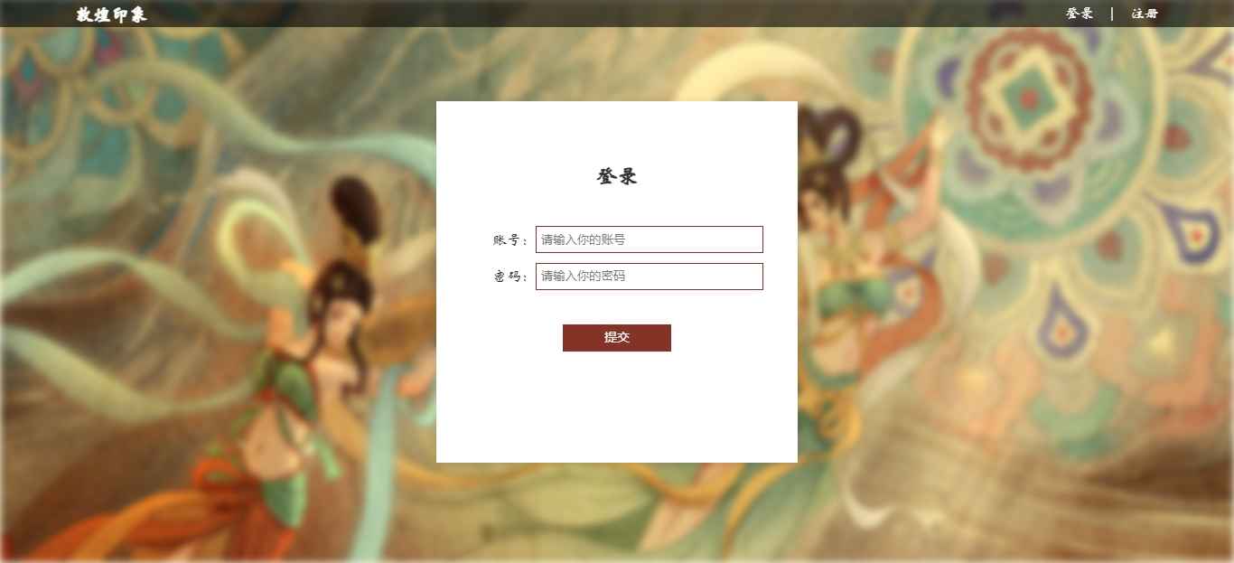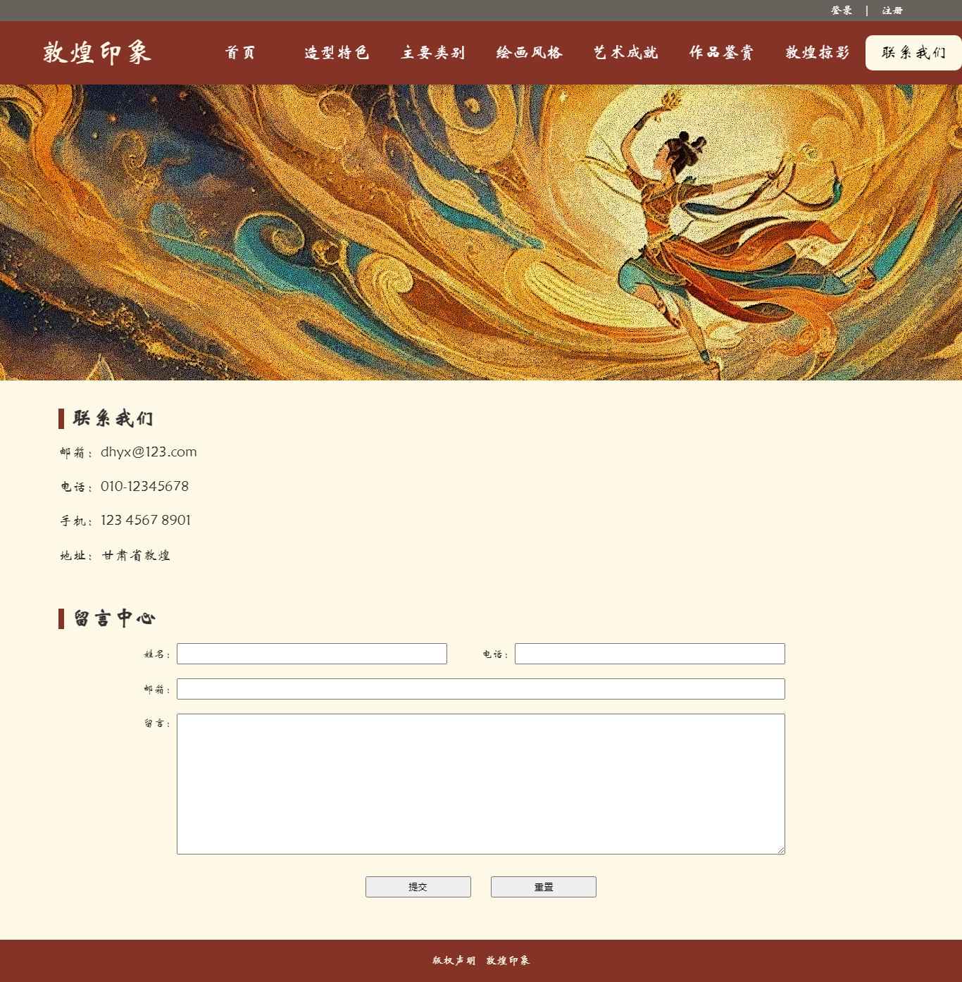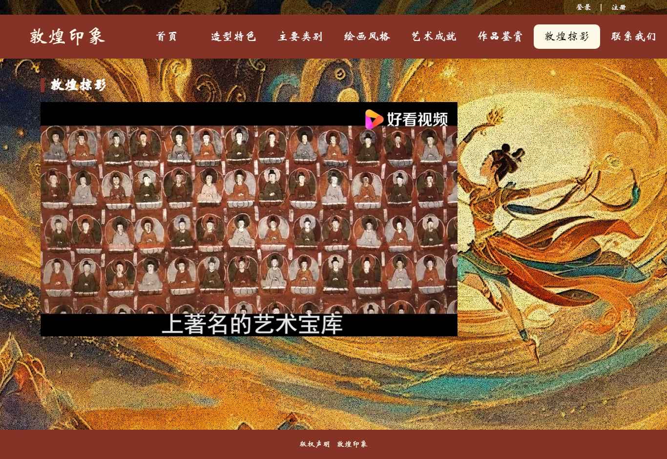 编号:2906 敦煌印象 11页 图片切换 视频 鼠标经过特效 登录 注册 留言表单 50元 css布局