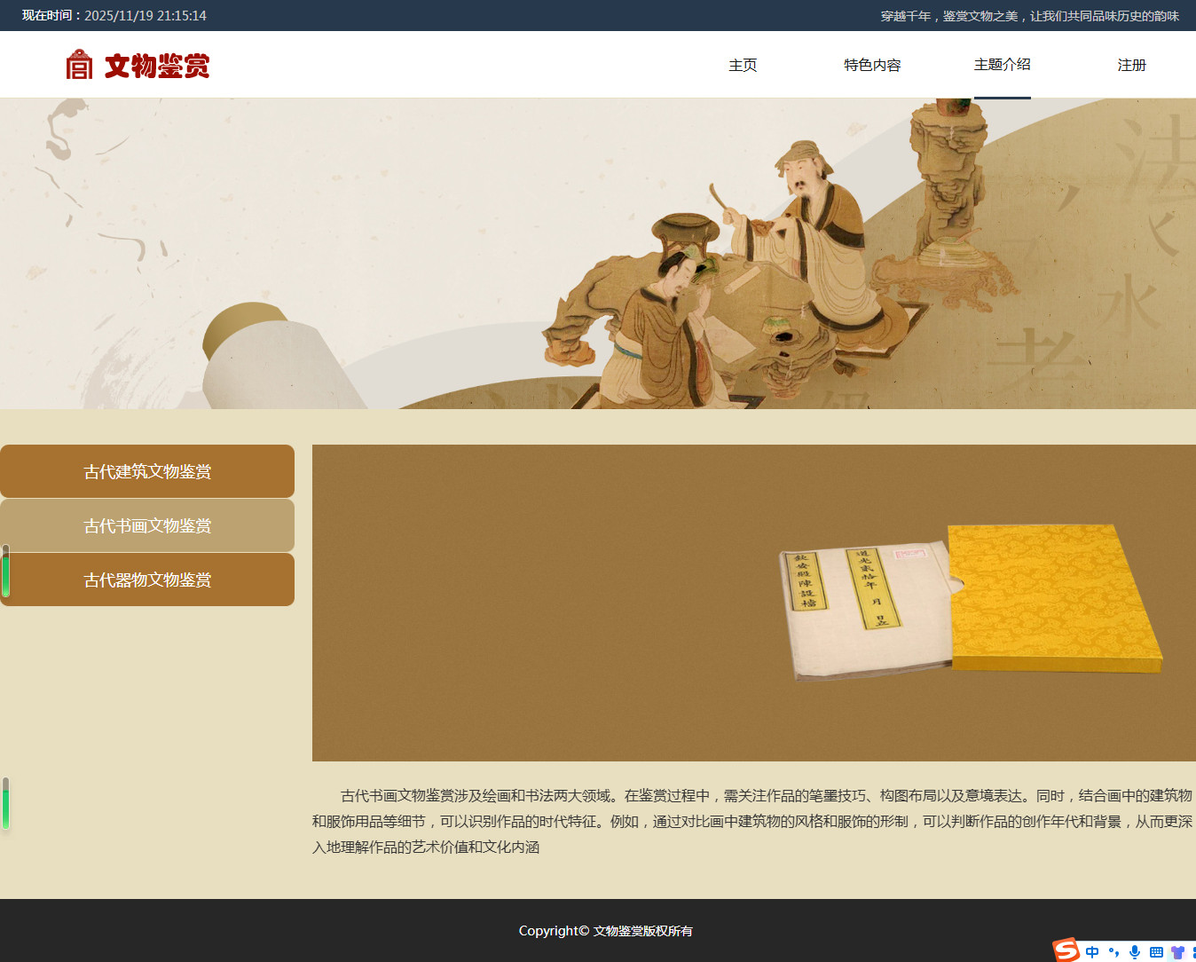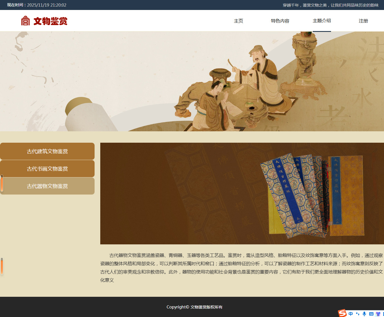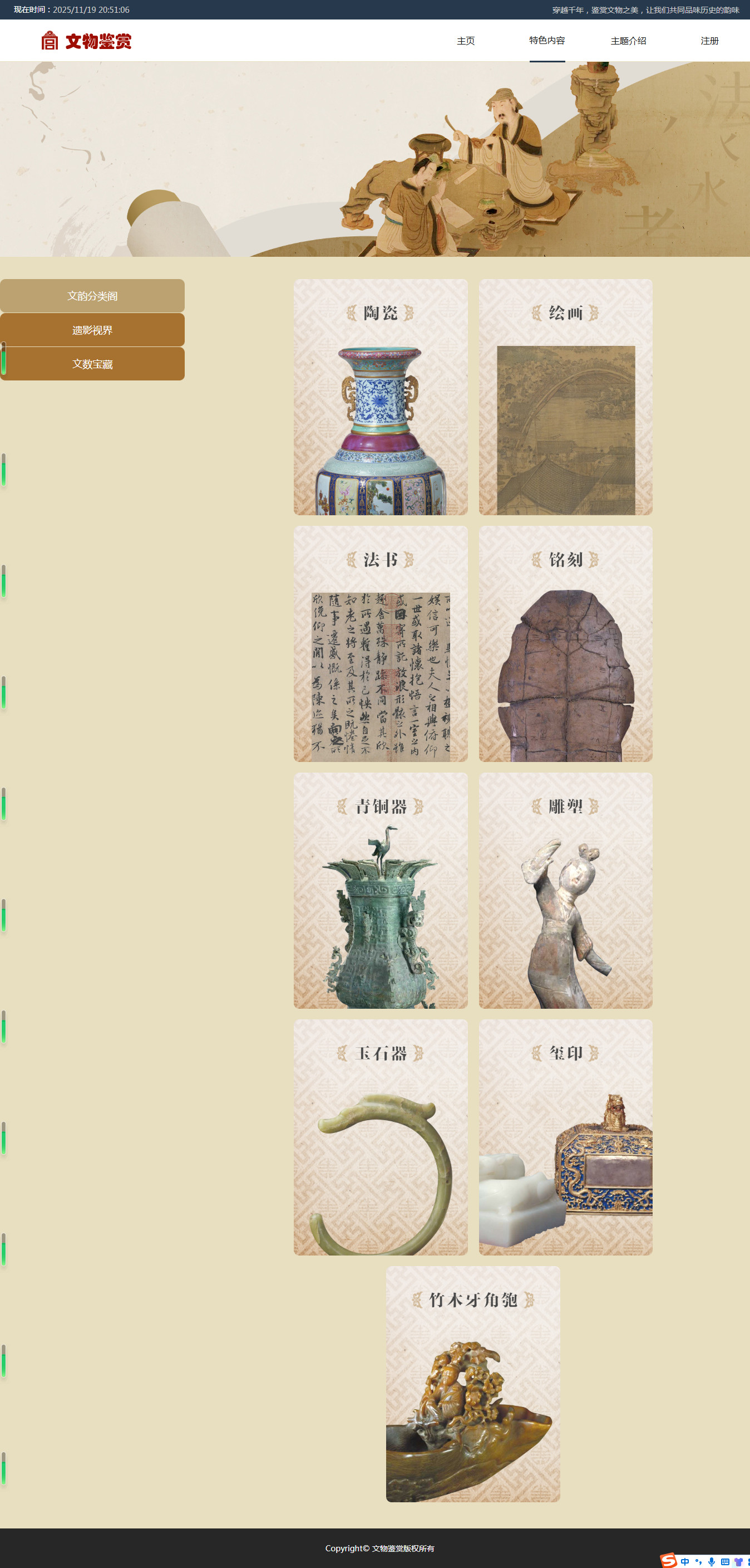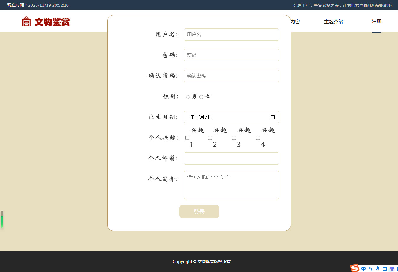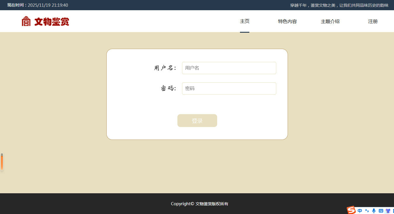 编号:2908 文物鉴赏 9页 鼠标经过特效 登录注册 html5自适应 40元 css布局